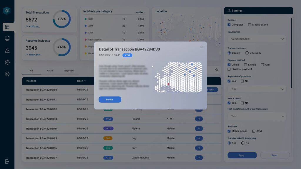 Náš systém pro detekci podvodů SYSEC využívající umělou inteligenci představuje moderní analytickou platformu navrženou k nepřetržitému sledování, vyhodnocování a odhalování podezřelých nebo podvodných aktivit v rámci finančních transakcí.