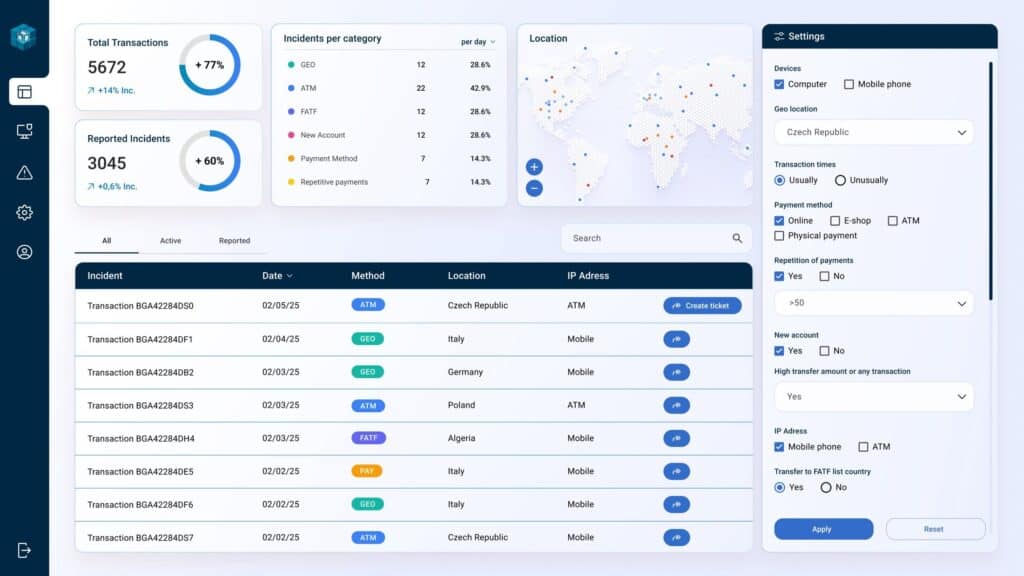 - Ochrana mezinárodních transakcí: Efektivně monitorujeme a vyhodnocujeme přeshraniční převody, čímž minimalizujeme riziko mezinárodních podvodů.
